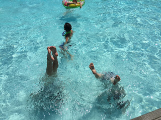 Sunday we headed to church and Justin stayed home with his girls. They learned how to drive the power wheels and loved every minute of it once again. Reese's friend Hallie came home with us from church and we headed to the pool again. Sam had practice again that afternoon so Lance took him while the twins napped and I stayed at the pool with Reese, Hallie, and Hayes. I laid out while they played.